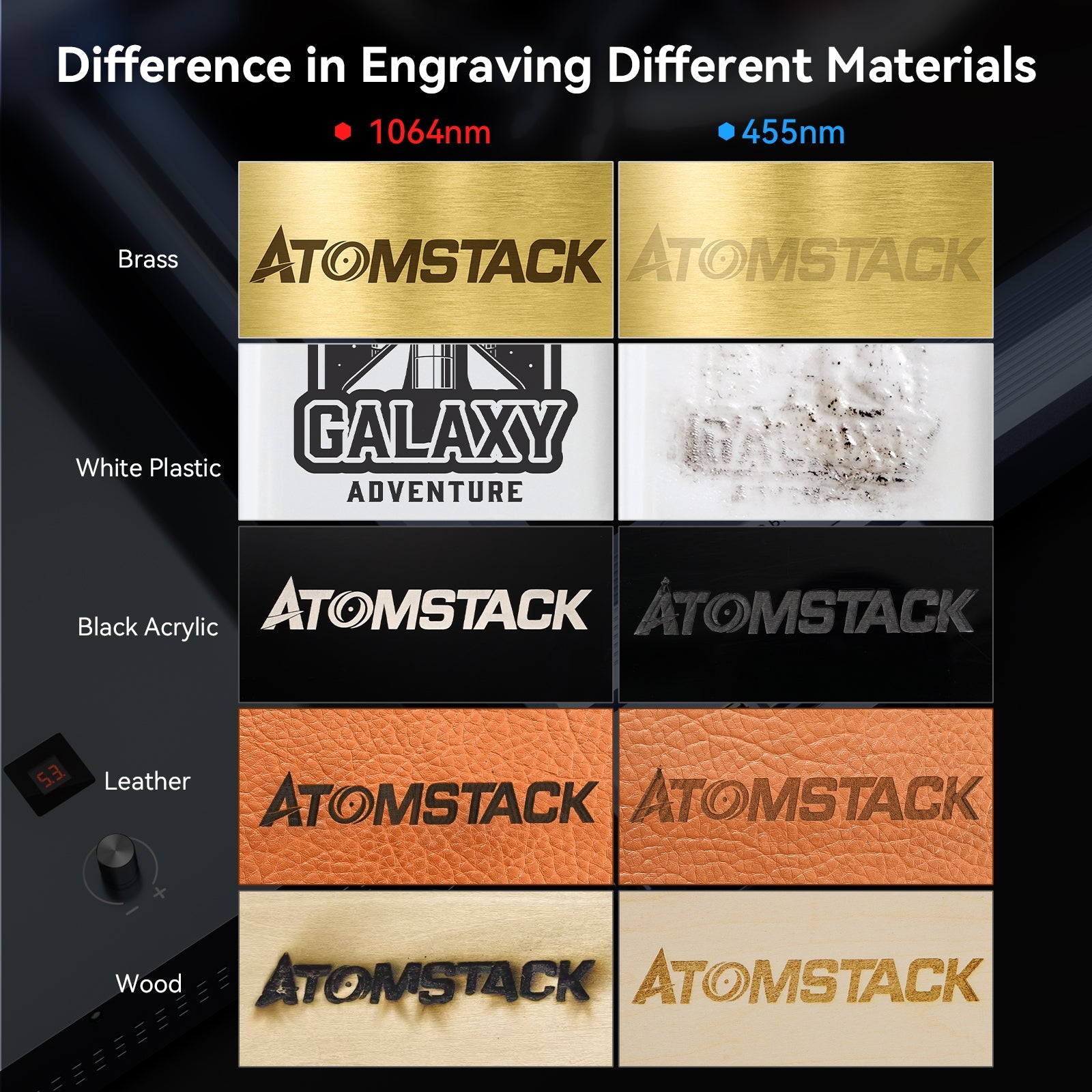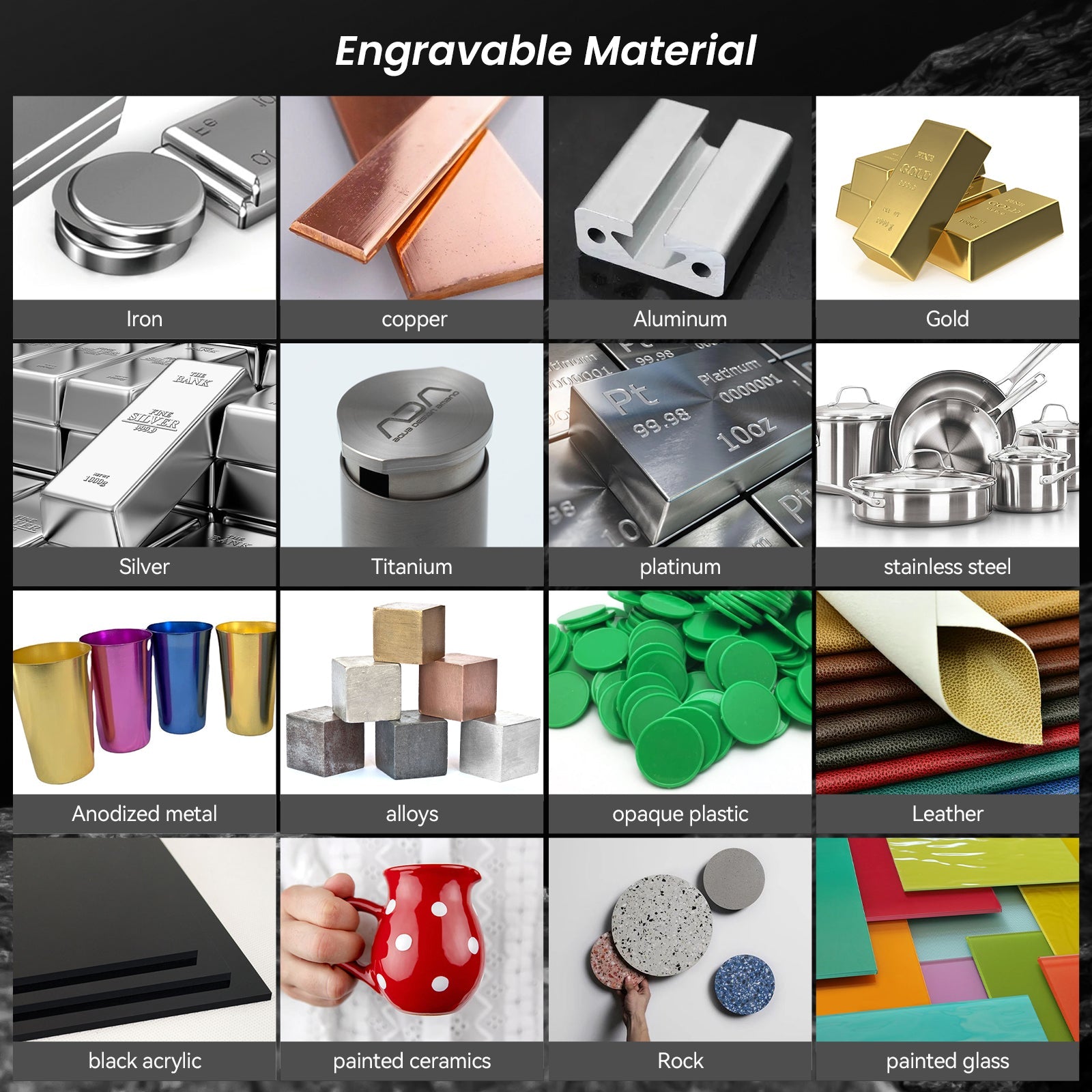 Engraving materials: PCB board, acrylic (non-transparent), aluminium oxide, plated and lacquered metal, 304mirror stainless steel, glass (non-transparent), ceramics, slate, leather;
